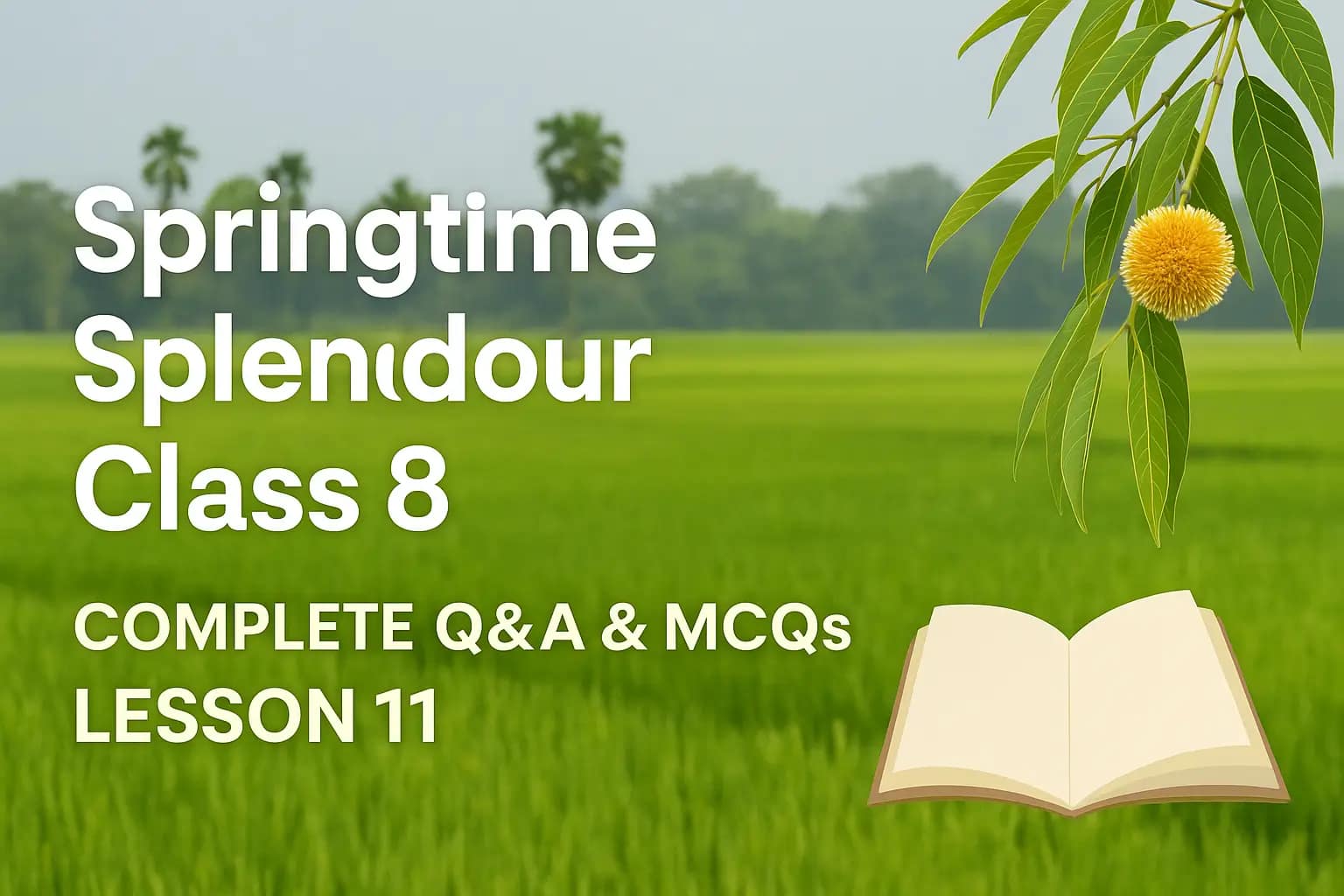 Bilingual (English & Assamese) PDF guide for Class 8 English: “Springtime Splendour” (Lesson 11). This easy-to-download eBook includes solved question‑answers, all textbook activities, additional practice questions, and 25 MCQs — the perfect study aid for Assam Jatiya Bidyalaya students.