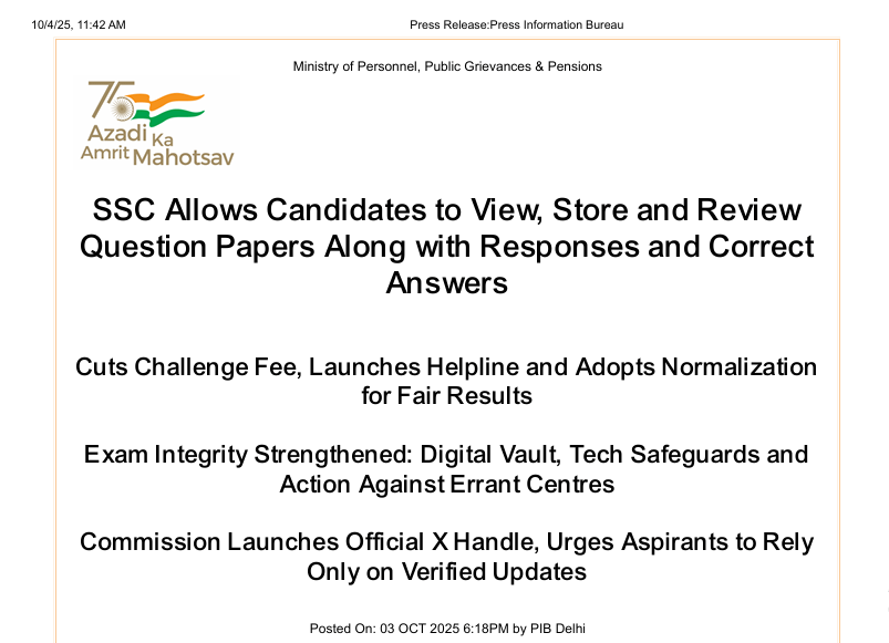 SSC exam reforms 2025 were announced in a Press Information Bureau release posted on 03 OCT 2025 at 6:18 PM (PIB Delhi). SSC will now allow candidates to view, store and review their question papers, responses, and the correct answers; reduce the answer-key challenge fee to ₹50 per question; launch an online feedback/grievance portal alongside the toll-free helpline 1800-309-3063; and adopt equi-percentile normalization to ensure fairness across multi-shift exams. The same release confirms the SSC CGL 2025 Tier-1 re-exam on 14 October 2025 for affected candidates and says the challenge process opens 15 October 2025.